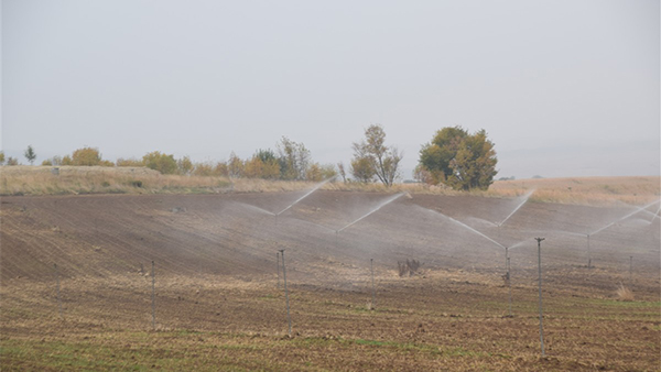 Imagen del cultivo de regadío con los aspersores en pleno funcionamiento.